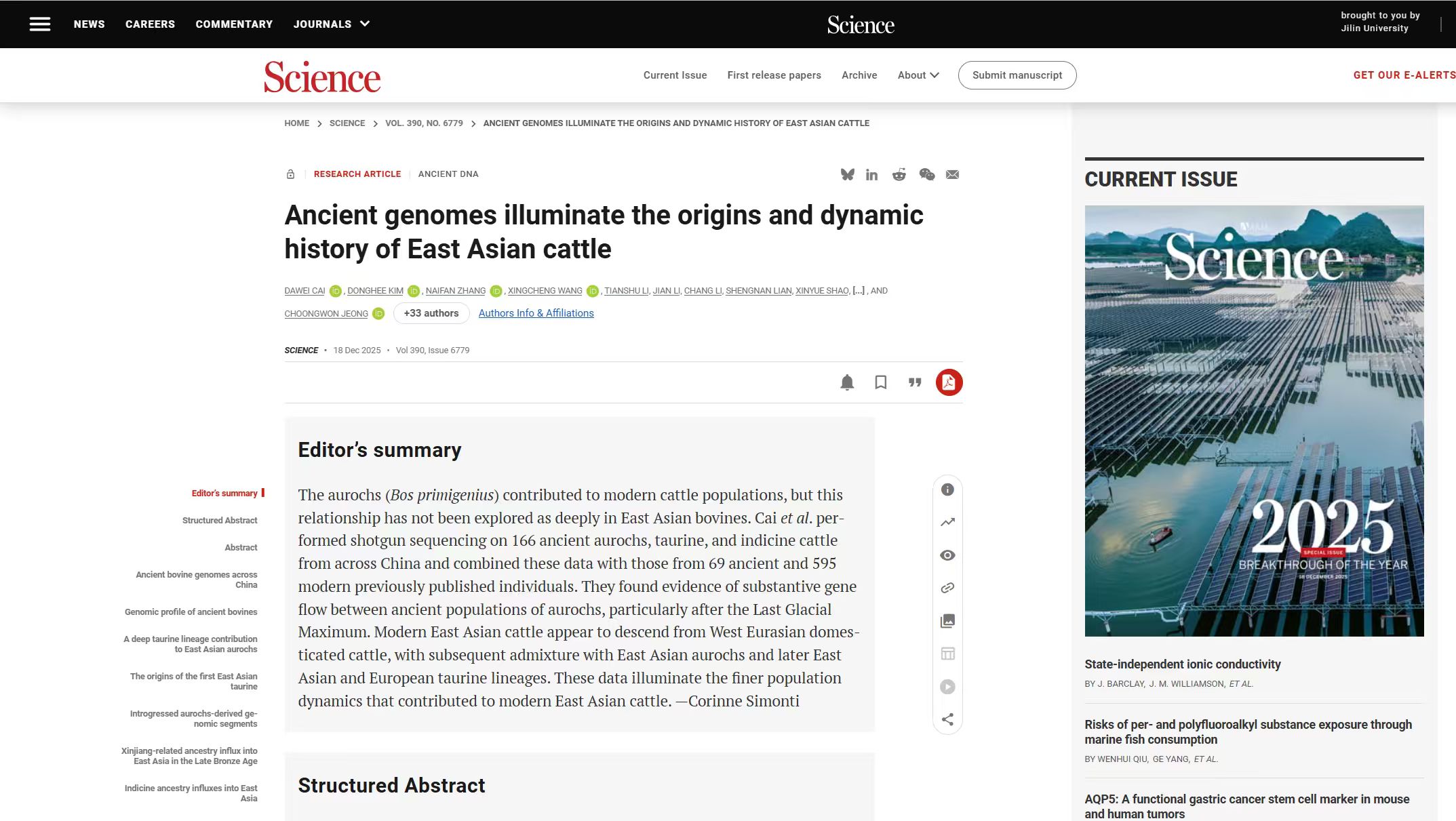 On December 19, 2025, a research team led by Prof. Cai Dawei from the Bioarchaeology Laboratory and the School of Archeology of Jilin University, in collaboration with Prof. Choongwon Jeong's team from Seoul National University, ROK and numerous domestic archaeological research institutions, published a research paper titled “Ancient genomes illuminate the origins and dynamic history of East Asian cattle” in the international academic journal Science. This study, for the first time, systematically constructed a complete genetic map of the origin and migration of east Asian cattle. Providing a new perspective for exploring prehistoric cross-continental human migration, technology transfer, and exchanges amongst ancient civilizations. This also marks the first time that Jilin University, as the first author's affiliated institution, has published research findings in Science in the field of philosophy and social sciences, signifying a breakthrough in the university's bioarchaeology research.