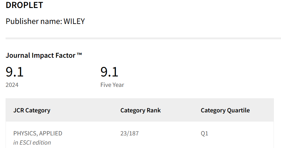 It was also selected for the High-Starting New Journal Initiative under the China Action Plan for Excellence in Scientific Journals. In April 2024, Droplet passed the comprehensive evaluation by Clarivate Analytics and was officially included in the Emerging Sources Citation Index.