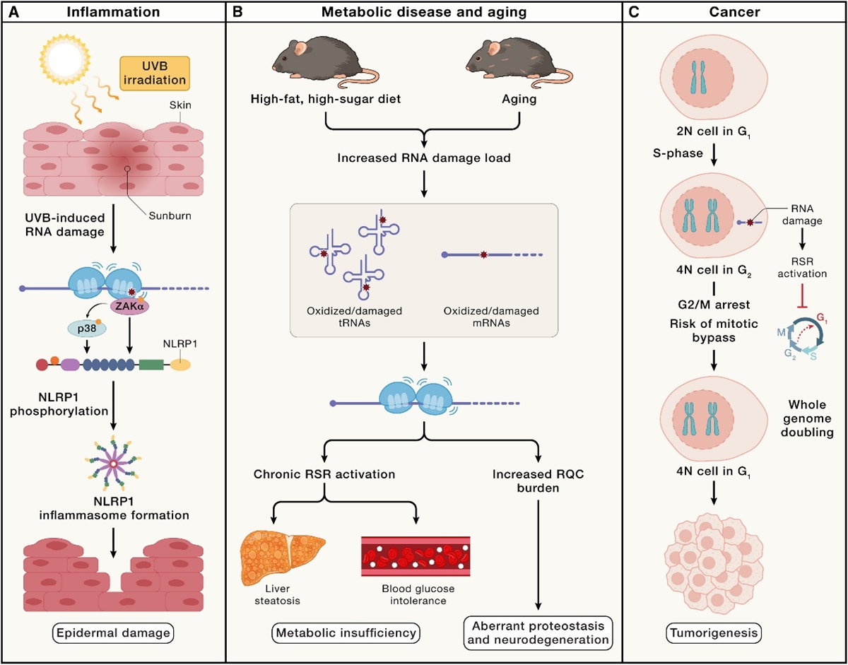 The review highlights how RNA damage impairs translation accuracy and cellular function, potentially triggering inflammation, cell cycle arrest, and cancer. It emphasizes two critical roles of RNA damage responses: preserving short-term cellular stability and acting as an early warning system for DNA damage.