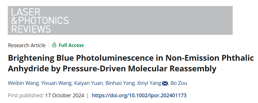 The findings were published in Laser & Photonics Reviews. Doctoral student WANG Weibin from JLU’s State Key Laboratory of Superhard Materials is the lead author and Professor YANG serves as the corresponding author of the research article titled Brightening Blue Photoluminescence in Non-Emission Phthalic Anhydride by Pressure-Driven Molecular Reassembly.