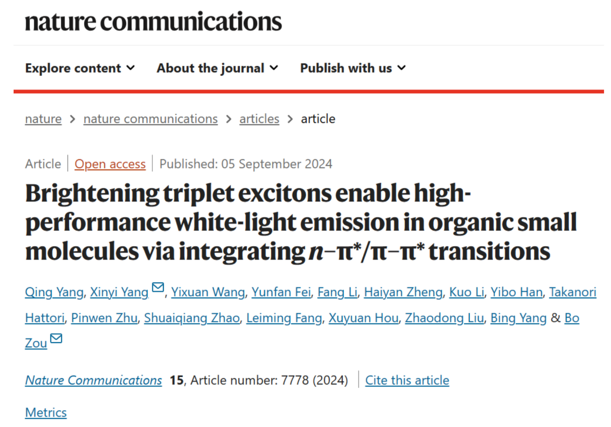 The article, Brightening triplet excitons enable high-performance white-light emission in organic small molecules via integrating n-π*/π-π* transitions, demonstrated the group’s significant progress in achieving high-performance white-light emission based on hybrid fluorescence and phosphorescence.