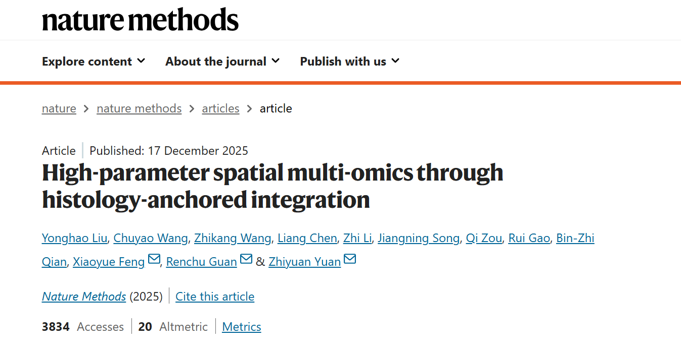 Recently, Professor Renchu Guan’s team from the College of Computer Science and Technology at Jilin University reported a major breakthrough in spatial multi-omics data analysis. The findings, titled "High-Parameter Spatial Multi-Omics through Histology-Anchored Integration," were published in the prestigious journal Nature Methods.