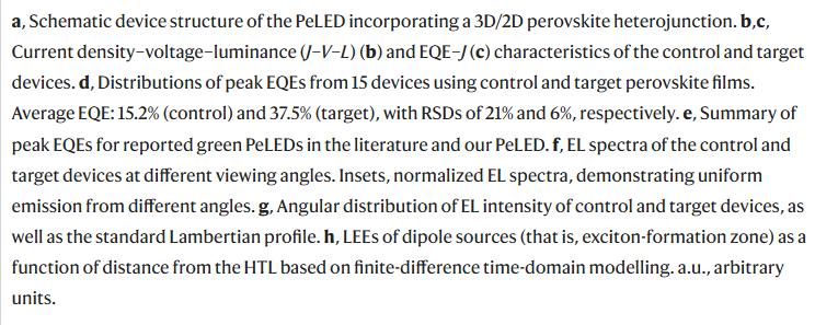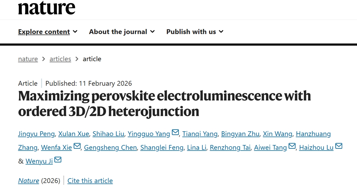 Recently, a research team led by Professors Ji Wenyu and Zhang Hanzhuang from the School of Physics at Jilin University, in partnership with Professor Xie Wenfa and Associate Professor Liu Shihao from the School of Electronic Science and Engineering, Professor Yang Yingguo from Fudan University, Professor Lu Haizhou from Southeast University, and Professor Tang Aiwei from Beijing Jiaotong University, reported major advances in improving luminescent interface and efficiency of perovskite light-emitting diodes (PeLEDs). The team reports a spontaneously formed 3D/2D vertically oriented perovskite heterojunction by means of a simple one-step spin-coating method. This structure effectively confines charge carriers and shifts the radiation zone away from the defect-rich surface region. The resulting PeLEDs achieved an EQE of 42.9% for the green emission (certified 42.3%), setting a new world record. The findings were published in Nature under the title “Maximizing perovskite electroluminescence with ordered 3D/2D heterojunction.”